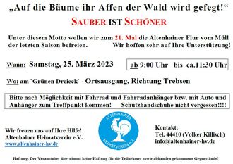 ... ist das Ziel des jährlichen Altenhainer Umwelttages, dem traditionellen Waldfegen. Am Samstag, dem 25. März 2023 wollen wir ein Zeichen setzen, dass Müll nicht in die Umwelt gehört und dafür werden wieder viele fleißige Hände benötigt. Traditionell im Frühjahr und wieder unter dem Motto „sauber ist schöner“ lädt der Altenhainer Heimatverein e. V. zum 21. Mal ein, die Altenhainer Flur vom Müll der letzten Saison zu befreien. Beginn ist 9:00 Uhr und der Treffpunkt das „Grüne Dreieck“, am Ortsausgang Richtung Trebsen. Bis ca. 11:30 Uhr sollen die gröbsten Hinterlassenschaften unverantwortlicher Zeitgenossen beseitigt sein. Es wird gebeten, nach Möglichkeit mit Fahrrad und Fahrradanhänger bzw. mit Auto und Anhänger zum Treffpunkt zu kommen! Bitte auch Schutzhandschuhe nicht vergessen!!!! Der Veranstalter übernimmt keine Haftung für die Teilnehmer sowie abhanden gekommene Gegenstände!