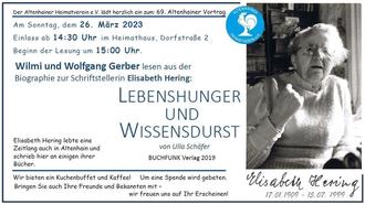 Einst lebte eine Schriftstellerin mit ihrer Familie am Butterberg in Altenhain, Frau Elisabeth Hering. Dort hat sie an mehreren ihrer Bücher geschrieben. Es gibt sogar eine Ausgabe, da wird Altenhain im Impressum genannt. Zu ihrem Leben ist nun ein Buch erschienen und wir konnten deren Tochter und Schwiegersohn für eine Lesung aus dieser Biographie gewinnen. Am Sonntag, dem 26. März 2023, ist Einlass ab 14:30 Uhr im Heimathaus und ab 15:00 Uhr beginnt die Lesung von Wilmi und Wolfgang Gerber aus der Biographie zur Schriftstellerin Elisabeth Hering: Lebenshunger und Wissensdurst von Ulla Schäfer. Gezeigt wird auch die Sammlung des Altenhainer Heimatvereins der Bücher von und über Elisabeth Hering.