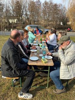Dann kam der Frühling – mitten im Februar. Statt Winterkälte schenkte uns der Tag frühlingshafte Temperaturen. Kurzerhand wurden Tische und Bänke vor dem Ofen auf der Wiese aufgebaut. Eine spontane Entscheidung, die sich als Glücksgriff erwies. Ab 15 Uhr trafen die ersten Backfreunde ein. Schwatzend, neugierig, mit Schüsseln, Teigen und guter Laune im Gepäck. Schnell waren alle Plätze besetzt, zusätzliche Tische mussten her. Genau so soll ein „offener“ Backtag sein: nicht kalkulierbar, sondern lebendig. Den Auftakt machte Elsässer Flammkuchen – dünn ausgerollt, knusprig gebacken, herzhaft belegt.