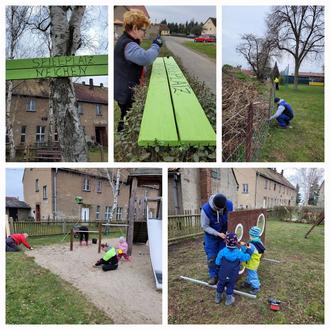 Aber auch am Spielplatz waren die Mitglieder des Vereins Mathias und Ulrike, sowie die Helfer Harald, Karin, Sarah, Janett und Ron fleißig beim Einsatz für die Jüngsten von Neichen. Der Spielplatz wurde auf Vordermann gebracht, damit die Kinder wieder viel Freude beim Spielen haben. Es wurde die Fußballwand erneuert, die Sandflächen vom Unkraut und Laub befreit, der Schwebebalken neu gestrichen und auch das Schild „Spielplatz Neichen“ wurde erneuert. Ebenso wurde ein Zaun angebracht. Unser Dank gilt daher auch Andreas Böthgen, der nicht nur den Zaun gesponsort hat, sondern auch am Samstag zusammen mit Marcel die Vorbereitungen dafür getroffen hat.