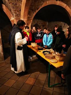 Bei dem Mönch gab es im Burggewölbe ungewöhnliches Spielzeug zu entdecken. Speisereste in Gestalt der Gänseknochen nutze man zur mittelalterlichen Freizeitgestaltung. Diese wurden zum Memoryspielen in eine mit Sand gefüllte Tonschüssel gesteckt und es galt, die zwei zusammenpassenden Knochen zu finden. Ebenfalls durften sich alle beim Schießen mit Pfeil und Bogen bewähren. Nur wenige trafen das Wildschwein und auch der Stelzenlauf oder der Kampf mit dem Holzschwert und Schild konnte geübt werden.