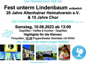 Gleich zwei Jubiläen können beim diesjährigen „Fest unterm Lindenbaum“ gefeiert werden! Das ist zum einen 20 Jahre Altenhainer Heimatverein e. V. und zum zweiten 15 Jahre Chor der fröhlichen Sängerinnen von Altenhain. Während der Altenhainer Heimatverein am 8. April 2003 als Förderverein für ein Begegnungszentrum in Altenhain gegründet wurde, geschah die Gründung vom Chor der fröhlichen Sängerinnen von Altenhain, durch Prof. Erdmann Röhlig, aus Anlass der Jahrfeier der 650-jährigen Ersterwähnung Altenhains. Deren erster öffentlicher Auftritt war dann auch zum Festwochenende am 6. bis 8. Juni 2008. Die Jubilare laden herzlich ein mitzufeiern, am Sonnabend, dem 10. Juni 2023 ab 13:00 Uhr im und vor dem Heimathaus, am Sportplatz, in der Dorfstraße 2. Das Programm beginnt um 15:30 Uhr mit Wilmi und Wolfgang Gerber aus dem Puppentheater Sterntaler. Sie spielen „Der Wolf und die sieben jungen Geißlein“. Gegen 16:30 Uhr gibt der Chor der fröhlichen Sängerinnen von Altenhain sein Jubiläumskonzert. Weiterhin wird Ponyreiten, Strohhüpfburg, Steckenpferdrennen und einiges mehr geboten. Auch zur Geschichte beider Jubilare kann man sich informieren. Parallel wird auch für das leibliche Wohl gesorgt. Es gibt Kaffee und Kuchen sowie Getränke und Gegrilltes.