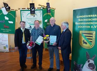 Zur Jahreshauptversammlung des „Landesverbandes Sächsischer Rassekaninchenzüchter“ werden in jedem Jahr verdienstvolle und erfolgreiche Züchter geehrt. Am 22. April war es soweit. Unser langjähriger Vereinsvorsitzende Eberhard Heimer (2. v. l.) wurde mit dem Ehrentitel „Meister der Sächsischen Rassekaninchenzucht“ ausgezeichnet. Es ist eine Anerkennung für über 50-jähriges erfolgreiches Wirken in der Rassekaninchenzucht. Zahlreiche große Erfolge hat Zuchtfreund Heimer in diesen Jahren mit seinen Kaninchen errungen. Die Altenhainer Züchter gratulieren herzlich zu dieser großen Ehrung.