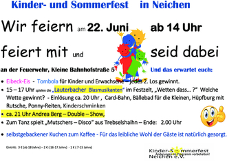 | Liebe Einwohner von Neichen, der Termin unseres Kinder- und Sommerfestes rückt immer näher. Es findet am 22. Juni 2024 statt. Die Vorbereitungen sind im vollen Gange. Aber ohne Ihre Hilfe geht es nicht. Wir benötigen noch Ihre Unterstützung für: | |