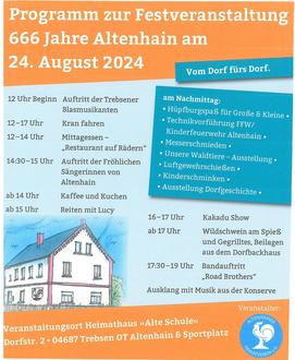 Unter dem Motto – „Vom Dorf fürs Dorf“ – laden Altenhainer Vereine am 24. August ab 12:00 Uhr zu einem Festtag 666 Jahre Altenhain ein. Auf dem Gelände des Sportplatzes und dem Heimathaus wird es neben viel Musik, Spiel und Spaß auch jede Menge Aktion und gutes Essen und Trinken geben. Das vollständige Programm entnehmen Sie bitte der beigefügten Anzeige. Die Veranstalter freuen sich auf einen tollen Tag mit vielen Gästen, schönem Wetter und guter Laune.