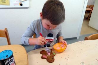 Ebenfalls vor Ort war Vetschaus Bürgermeister Bengt Kanzler. Er nutzte die Gelegenheit, um sich bei den Kita-Mitarbeiter/-innen von Herzen für ihr großes Engagement zu bedanken. Zum Abschluss und Dank sangen die Kinder ein Lied, das bei ihnen gerade ganz hoch im Kurs steht: das Igel-Lied. Und das sorgte nicht nur bei den Kindern für Begeisterung, sondern auch bei den Erwachsenen. Devid Raab: „Das haben sie wirklich ganz toll gemacht. Auch wenn es kein Weihnachtslied war, passte es ganz einwandfrei.“ Denn in einem aktuellen Projekt in Zusammenarbeit mit dem NABU beschäftigen sich die Missener Kita-Kinder intensiv mit den kleinen stacheligen Wildtieren. Wenig später machten sich die Kinder mit Freude daran, ihre Lebkuchenmänner weihnachtlich zu dekorieren.