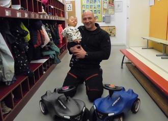 André Gärber, der Chef vom Autoservice Spreewald, überraschte unsere Einrichtung Anfang Dezember mit zwei tollen Flitzern. Als Inhaber einer KFZ Meisterwerkstatt hatte er einen ganz besonderen Blick auf alle Gebrauchtwagen in unserem Fahrzeugschuppen. Die heißbegehrten Fahrzeuge waren durch die täglichen Ausfahrten ganz schön in Mitleidenschaft gezogen. Herr Gärber, selbst Papa von drei Kindern, spendierte uns kurzerhand für die Krippenkinder zwei tolle Neuwagen. Die hochwertigen Bobby Cars wurden natürlich sofort eingeweiht und ausprobiert.