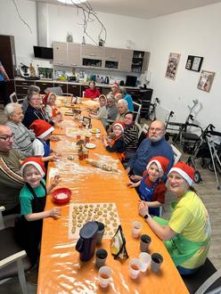Vorbereiteter Teig lag bereits aus, sodass sich jeweils ein Besucher der Tagespflege und ein bis zwei Kinder zu kleinen Backteams zusammenfanden. Gemeinsam rollten sie den Teig aus und stachen mit verschiedenen Förmchen die Plätzchen aus – eine schöne Gelegenheit für Jung und Alt, miteinander ins Gespräch zu kommen.