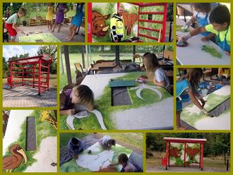 Mit Handschuhen, alten Waschlappen, Pinseln und nackten Füßen ging es an die Hintergrundgestaltung. Es wurde abstrakt und wild. Zwei Zufallstechniken kamen zum Einsatz. Mit der Tupftechnik wurde die grobe grüne Grundstruktur festgelegt, bevor es mit wilden Spritzern weiter ging. Jede Menge Spaß und der ein oder andere Farbspritzer im Gesicht waren vorprogrammiert. Vier Tiere wurden mit ruhigen Händen in einer monochromen Farbzusammenstellung gestaltet. Eine dynamische Kontur und ein paar Strukturelemente rundeten das Ganze ab. Am 09. September wurden die fertigen Platten dank des Bauhofes montiert.