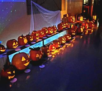 Dank unserer fleißigen Eltern gab es ein reichhaltiges Buffet der besonderen Art mit Hexenfingern, Mumienwürstchen, Spinnenmuffins, Monstergötterspeise oder Zombiebowle für jeden Gaumen war etwas dabei. Beim Kürbiskarren und -kegeln sowie Fledermauszielschießen war unsere Geschicklichkeit befragt. In der Gruseldisco wurden Mumien gewickelt, Spinnen eingefangen und das verkleidende Tanzbein geschwungen. Und wer noch nicht genug hatte, traute sich ins Gruselkabinett. Hier versteckten sich Irrlichter, Hexen, Monster und sogar Wednesday persönlich um den Mutigen das Fürchten zu lehren. Ein Spaß bis zum Schluss, denn die Prämierung der drei schönsten Kürbisgesichter stand zum Abschluss auf dem Programm. 35 Exemplare erleuchteten den Flur mit ihrem schaurig schönen Licht. Ein unvergesslicher Anblick für alle kleinen und großen Halloweenpartygäste. So konnte der Feiertag kommen, der bei uns Reformationstag heißt und Zeit zum Revue passieren oder zum Planen für neue Ferienabenteuer lässt.