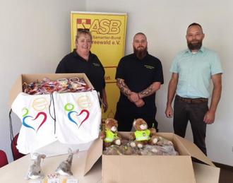 Der ASB Spreewald übergibt Beate Bergmann und David Weigt vom Team der Psychosozialen Notfallversorgung -PSNV- die, u.a. mit den Spenden der Seniorenkaffeetafel Stadtfest Vetschau, beschafften Einsatzmittel.