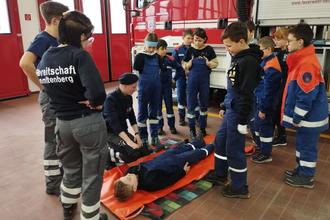 Im Stationsbetrieb lernten sie das Anlegen von Verbänden, das Sichern von Personen und die Arten der verschiedensten Tragemöglichkeiten. An einer Übungspuppe konnte die Herz-Lungen-Wiederbelebung trainiert werden. An einer weiteren Station wurde die Ausstattung eines Rettungswagens erklärt. Am Ende des Ausbildungstages gab es noch ein leckeres Mittagessen, Nudeln mit Tomatensoße. Nicht eine Nudel blieb am Ende übrig und so fuhren alle gestärkt nach Hause.