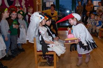 Die Radduscher Kita hat stilecht und traditionsgetreu die Vogelhochzeit in der Sport- und Kulturscheune gefeiert, die bis auf den letzten Platz gefüllt war. Leiterin Michaela Murrer: "Wir freuen uns, dass alle 24 Darsteller und Darstellerinnen vollständig und gesund sind, etwas, was eine Zeit lang gar nicht so war!" Viele Eltern und Großeltern haben sich Zeit genommen, um den Kindern zuzusehen und vor allen Dingen zuzuhören. So manch Erwachsener wird stolz und staunend zugleich wahrgenommen haben, dass die Kinder eine Sprache sprechen, die sie selbst kaum oder nicht verstehen, denn Teile des Programms waren in nieder wendischer Sprache. Mit der Kinder eigenen Selbstverständlichkeit sangen sie wendische Lieder so, als würden sie das jeden Tag tun – was auch tatsächlich im Rahmen des WITAJ-Projektes der Fall ist: Die Erzieherinnen arbeiten mit den Kindern zweisprachig, allen voran Ute Körner. Mit großem Ernst und Eifer in der Sache, zelebrierten die Kinder die Vogelhochzeit, tanzten um das Brautpaar und überreichten ihnen Geschenke. Eingeleitet wurde die Zeremonie mit den überlieferten Sprüchen. Rabe: „Ach liebe Elster, du schaust so nett, so freundlich, höflich und adrett. Ich glaube, ja, ich liebe dich. Ach, liebe Elster, willst du mich?“ Elster: „Ach Rabe, du gefällst mir sehr. Komm schnell ganz dicht hier zu mir her! Sag, wollen wir Hochzeit halten, du und ich? Wir lieben uns doch inniglich!“ Hochzeitsbitter: „Der Póbratš bin ich, auch Hochzeitsbitter genannt und ziehe um im Spreewaldland. Hat sich ein Paar ganz frisch verliebt, dann sorge ich dafür, dass es eine fröhliche Hochzeit gibt!“