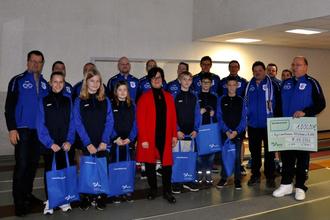 Freudige Überraschung beim Bundesligaheimspiel der Vetschauer Kegler. Astrid Gehrke, Privatkunden-Beraterin der BBBank e.G. Filiale Potsdam, überreichte an den Jugendwart Jörg Gresch im Beisein der Bundesligamannschaft und einer kleinen Abordnung der Jugend sowie dem Vereinsvorsitzenden Gerd Kschiwan und Bürgermeister Bengt Kanzler einen Scheck in Höhe von 1000 € für jahrelange kontinuierliche Jugendarbeit. Freude beim Verein über die Zuwendung, aber auch die Kinder freuten sich über die Sachgeschenke, die sie von Frau Gehrke erhielten. Dankeschön von unserer Seite für diese Unterstützung.