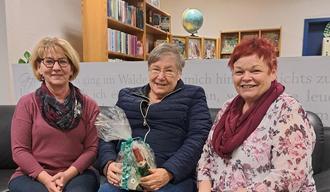 Herzlichen Glückwunsch zum 70-jährigen Jubiläum als Bibliotheksmitglied sagt das Team der gemeinsamen Bibliothek Lübbenau – Vetschau! Beeindruckende sieben Jahrzehnte kommt unsere treuste Leserin, Frau Barbara Faustmann, mit ihrem großen Bücherkorb regelmäßig zum Büchertausch. Bereits als Schulkind meldete sie sich 1953 in der Stadtbibliothek in der Karl-Marx-Straße an. Fräulein Ruben, die damalige Bibliotheksmitarbeiterin versorgte sie mit spannenden Kinderbüchern – heute sind es die langjährigen Mitarbeiterinnen Frau Hellmann und Frau Schierack, die Frau Faustmann mit passender Lektüre versorgen. Beide überreichten ein Jubiläumspräsent und gratulierten herzlich.