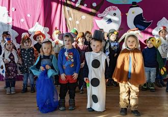 Alle Kinder der großen Gruppe erlebten im Januar die sorbische Vogelhochzeit, von echten Schauspielern vorgespielt in der Stadthalle. Schon auf dem Nachhause-Weg im Reisebus war das Geschnatter der Kinder sehr groß, denn am nächsten Tag war die Aufführung unserer Vogelhochzeit in der großen Kulturscheune Raddusch geplant. Viele Eltern, Großeltern und Geschwisterkinder warteten schon neugierig auf unsere kleinen, bunt verkleideten Schauspieler. Mancher Zuschauer fragte sich schon im Vorfeld: “Wer wird denn in diesem Jahr das Vogelhochzeitspaar sein!” Dann ging es los. Der póbratš (Hochzeitsbitter) führte durch das Programm. Nach vielen Liedern, Gedichten und Tänzen um den Brauch, war es soweit. Das Geheimnis wurde gelüftet. Der Rabe Felix führte seine Braut Ellena zum póbratš. Dieser vermählte wron und sroka (Rabe und Elster), so wie es schon viele Jahre nach sorbischer Tradition Brauch ist. Alle Kinder, die als Vögel verkleidet waren, tanzten am Schluß der Vogelhochzeit mit dem Brautpaar mit und jubelten ihm zu. So endete das erste große Fest unserer Kita im neuen Jahr.