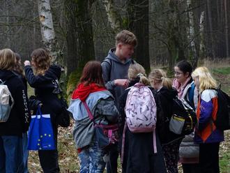 Sie waren viele: fünf Klassen - drei fünfte und zwei neunte, die im Wald und auf der märkischen Heide bei Lobendorf nach dem richtigen Weg suchten, Aufgaben lösten und offensichtlich Spaß dabei hatten. Die Neuntklässler waren für die fünf Stationen verantwortlich, deren Lage man mit Hilfe einer Karte finden musste und dort ein Albert Schweitzer Rätsel lösen konnte, mit Pfeilen zerschoss, was einen zum Platzen bringt, eine Welt unter Glas erschuf, ein Video über die Ehrfurcht vor dem Leben machte….Außerdem begleiteten sie die sechs Fünftklässler auf ihrer Wanderung mit viel Freude und Verständnis. Die fünften Klassen ihrerseits fanden es cool mit den Neunten zusammen durch den Wald zu laufen und mit ihrer Hilfe die Aufgaben zu erfüllen. Die Klassenleiter waren als Streckenbeauftragte zwischen den Stationen unterwegs und haben ihre Kinder zusätzlich motiviert. Der Weg führte zu einem großen Windrad im Wald, weiter in Richtung Autobahn und dann zurück über die Crossbahn nach Lobendorf. Insgesamt 6 Kilometer, die alle ohne Probleme bewältigt haben und am Schluss noch einen Schatz für jede Gruppe suchen sollten.