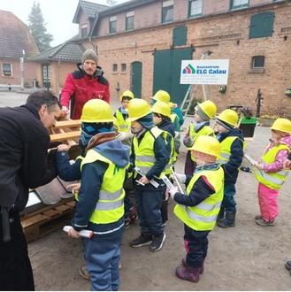Am 6. März begaben sich die Kinder und auch die Erzieherinnen der Kita "Am Storchennest" auf Entdeckungsreise in die Welt des Handwerks. Sie trafen sich auf dem Hof von Frank Richter, dem Inhaber der Firma Frank Richter Dachdecker-Klempnerhandwerk, um dort Einblick in das Handwerk der Dachdeckerei zu bekommen. Aber vorerst mussten auch die Kleinen den Arbeitsschutz beachten. Sie bekamen von Frank Richter und Michel Nixdorf jeweils einen kleinen gelben Bauarbeiterhelm. Die Firma M.T. Reiche übergab gelbe Schutzwarnwesten und von der ELG Calau gab es als Arbeitsmaterial jeweils einen Zollstock sowie einen Zimmermannsbleistift. So waren alle für die kommenden Stunden gut ausgerüstet.