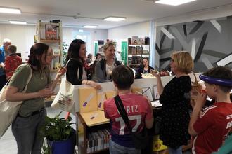 „Liebes Bibliotheks-Team, ich sende euch ein Riesenlob … Es war eine Nacht der Momentaufnahmen für mich, kurz und knackig! Alte, junge, selbst Kinder – sie alle „quollen“ in die Bibliothek hinein und wurden von euch so herzlich empfangen, gleich mit einem „Wachmacher“ (ein Cocktail der MoCoBar / Jugendprojekt des ASB) und verzaubert von bunten Luftballonkreationen (mit Zauberern). Die Nachfrage war endlos. Im Labyrinth der Regale fand man interessante Bücher, Zeitschriften … für jeden war etwas dabei. Kinder, die malten und nette, ganz nette Frauen, die sich „abmühten“, um den wissbegierigen Besuchern Zitate aus berühmten Büchern und Filmen zu entlocken, um sie danach gebührend zu belohnen. Und wie alle ehrgeizig waren! Obendrauf noch ein Quiz. Alle waren glücklich. Im Hintergrund bastelten kreative Mitarbeiterinnen und gaben ihr Bestes, um Bücher neu zu „definieren“ (Buchbasteleien aus gebrauchten Büchern).