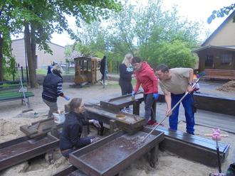 Bei herrlichem Sonnenschein fand am 27. April, der diesjährige Frühjahrsputz statt. Dieser Einsatz stand unter dem Motto: „Viele Hände, schnelles Ende“. Zahlreiche Eltern kamen mit ihren Sprösslingen und wollten helfen. Sie brachten Pinseln, Harken und Schippen mit. Alle Holzzäune, sowie Bänke, Tische und Spielgeräte bekamen eine frische Holzlasur. Der Spielplatz wurde fit für den täglichen Sommeraufenthalt der Kinder im Freien gemacht. Kisten mit Sandspielzeug fanden ihren Platz am Sandkasten und der Spielzeugschuppen wurde aufgeräumt. Das Hochbeet wurde schick gemacht und überall Unkraut gezupft. Außerdem wurde Muttererde und Hackschnitzel auf dem Außengelände verteilt. Als Stärkung reichte der Förderverein der Kita, Grillwürste und Getränke.