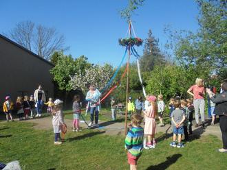 Ein weiterer Höhepunkt fand am 30. April auf unseren Spielplatz statt. Der mit bunten Bändern geschmückte Maibaum wurde mit Hilfe unserer starken Jungs der Kita aufgestellt. Zum Lied „Majski bom“ fand der Bändertanz statt. Die Bänder tragen die sorbisch/wendischen Farben, also blau, rot, weiß. Das Aufstellen des Maibaumes gilt als Symbol des Frühlings, des neu erwachten Lebens und der Fruchtbarkeit. Er spendet Glück, Gesundheit und Freude. Stolz zeigt am Nachmittag die Kinder den Baum ihren Eltern und erzählten von dieser schönen Tradition!