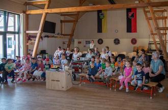 Fakten, Fragen, Unterhaltsames … die aufmerksam zuhörenden Kinder brauchten zwischendurch eine Pause und tobten sich mal kurz auf dem Hof vor der Radduscher Sport- und Kulturscheune aus. Einige Kinder waren noch bei der Verarbeitung des Erlebten, wie Leo Exner: „Ich wusste gar nicht, dass Hörner hohl sind und warum die Kühe Nummern an den Ohren haben!“. Für Amelie Weise war es das Maus fressende Huhn, welches sie in Erstaunen versetzt hat. Jannis Orsin mag Schweine: „Ich freue mich schon darauf, ich finde ihr quieken so schön“. Sprach’s, und verschwand mit den anderen Kindern wieder in der Scheune zum zweiten Teil. Vor Beginn der Veranstaltung hatte Michael Petschick vom Biosphärenreservat die Gelegenheit genutzt und im Auftrag der Bürgerstiftung Spreewald vor den Kindern eine Mittelzusage in Höhe von 1000 EUR gemacht, damit sich die Kita (eine Biosphärenkita) bessere Bedingungen im Rahmen ihres Waldprojektes schaffen kann.