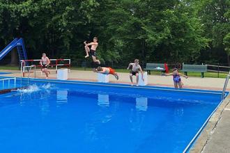 Eigentlich sollte das Vetschauer Sommerbad bereits eröffnet sein. Eine Unwetterwarnung für das Wochenende hatte aber der Badesaisoneröffnung einen Strich durch die Rechnung gemacht. Zum zweiten Versuch setzte Bürgermeister Bengt Kanzler am 5. Juni mit Unterstützung einiger Vetschauer Kinder an. Bei nicht besonders warmen 21 °C Luft- und Wassertemperatur sprangen sie alle gemeinsam als erstes ins Becken. Nun heißt es erst einmal auf wärme Tage hoffen.