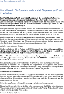 Die Spreeakademie lädt im Auftrag der BTU Interessierte zur Informationsveranstaltung „Bürgerenergie für echte Teilhabe und Wertschöpfung in der Region – Auftakt von MachMaWatt!“ am 10. Juli 2025 um 16:30 Uhr im Alten Gasthof Missen.