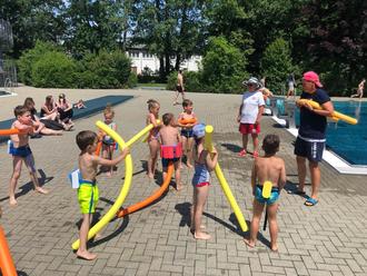 ... so kalt war es dann doch nicht. Bei sonnigen 32 Grad Luft- und 25 Grad Wassertemperatur wurde das diesjährige Schwimmlager der Vetschauer Kita Zauberhand nach 2 Wochen erfolgreich abgeschlossen. Zahlreiche Zauberländer wurden im Calauer Freizeitbad unter der Leitung der Ausbilderinnen Adele Zeiger-Pusch und Kerstin Gensch vom "Nichtschwimmer" zum stolzen Besitzer des Seepferdchen und auch sogar Bronze Abzeichens erkoren. Die kleinsten (4 Jahre) begannen mit der Wassergewöhnung, während die fortgeschrittenen mit dem Training für die Abzeichen begannen. Der Angst vorm Tauchen wurde erneut mit dem Einsatz der Trillerpfeife entgegengewirkt, mit dem Versuch, unter Wasser zu pfeifen. Letztlich haben alle von den Trainingseinheiten profitiert und diese wichtige Etappe geschafft.
