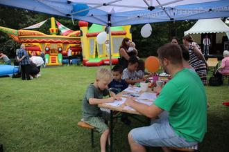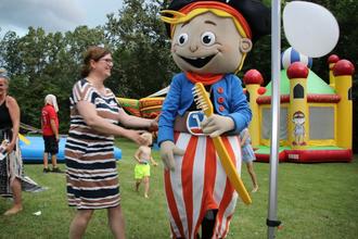 Die Mitmach-Stationen waren heiß begehrt, so z. B. das Riesen Piratenschiff zum Klettern, Hüpfen und Rutschen, die Aqua Riesenkugeln, eine verrückte Drehleiter, Kinderschminken und Glitzertattoos. Das REWE Team aus Vetschau unterstützte den Kindertag auch in diesem Jahr mit einem Frischestand vor Ort. Melone wurde kostenfrei verteilt. Die Spreewaldbank und ihr Zahnpirat waren besonders beliebt. Der lustige Kerl lud die Kinder zum Stand ein, an dem gemalt wurde und es tolle Preise für die richtige Zahnpflege gab. Auf der Bühne lief gerade die TOM TOM Kindershow, als das Wetter plötzlich umschlug und wenig später alle knöcheltief im Wasser standen. Leider musste das Fest daraufhin abgebrochen werden.
