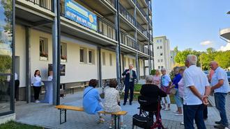 Direkt im Gebäude konnten sich die Besucher auch die dort ansässige Tagespflege des ASB Ortsverband Spreewald e. V. ansehen. Schon beim Eintreten duftete es nach frischem Kuchen. „Wir backen hier öfter, einmal monatlich kochen wir gemeinsam mit unseren Tagesgästen. Basteln, Spiele spielen, hauswirtschaftliche Tätigkeiten aber auch Gartenarbeiten werden von den Senioren gern angenommen“, verrät Pflegedienstleiterin Kati Schilmann. 15 Plätze stehen hier für die Betreuung vorwiegend älterer Menschen montags bis freitags zur Verfügung. In einem großen lichtdurchfluteten Raum verbringen jene den Tag überwiegend zusammen. Separate Ruhemöglichkeiten sowie ein Pflegebad, wohin auf Wunsch der Friseur kommt, stehen ebenfalls zur Verfügung. „Mit dem heutigen Tag weihen wir auch unseren neuen Außensitz ein. Darauf haben wir schon so lange gewartet. Die WIS hat es möglich gemacht.“ Auch Alexander Kohl, Geschäftsführer des ASB Spreewald e. V. zeigt sich zufrieden: „Wir freuen uns, dass es mit der WIS nun vorwärts geht und vor allem dieses Bauprojekt endlich abgeschlossen wird. Es ist ein gutes Miteinander.“ Er und sein Team haben mit Feldküche und Getränken einen kleinen Imbiss für die Besucher vorbereitet. Jene ließen sich gern an den Biertischen nieder, ließen sich Erbsensuppe und Bratwurst schmecken und tauschten nach den Besichtigungen noch ein wenig ihre Eindrücke miteinander aus.