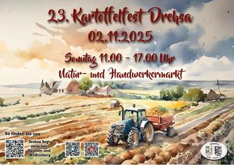 Am Sonntag, den 2. November 2025, lädt der Heimatverein Drehsa-Wurschen e.V. wieder herzlich zum beliebten Kartoffelfest in Drehsa ein. Ab 11 Uhr erwartet Sie ein lebendiger Natur- und Handwerkermarkt, der bis etwa 17 Uhr geöffnet ist. Zahlreiche Händler und Kunsthandwerker präsentieren dort ihre regionalen Produkte, liebevoll gefertigten Arbeiten und viele kleine Besonderheiten zum Stöbern und Entdecken.