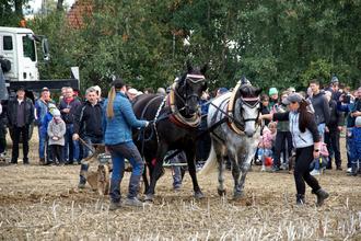 Lauschende Stille stellt sich ein, als Bernd Böhme vom ortsansässigen Pferdehof das Pflügen mit reiner Pferdekraft anhand Schimmelstute Alina und Rappstute Amelie schildert und von den Anfängen ohne motorisierte Technik erzählt.