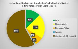 Insgesamt befinden sich im Landkreis Bautzen etwas mehr als 5.850 Erneuerbare-Energie-Anlagen, darunter 5.700 Photovoltaikanlagen. Diese erzeugten knapp 630 Gigawattstunden (GWh) Strom. Rund 42 % des landkreisweiten Strombedarfes kann damit rechnerisch gedeckt werden (siehe Abbildung). Die Betreiber der Anlagen im Landkreis Bautzen erhielten im Jahr 2021 ca. 66 Millionen € Vergütung für das Einspeisen des Stromes in das Stromnetz. Die größte Strommenge wird in der Gemeinde Spreetal (54 GWh), gefolgt von der Stadt Lauta und der Gemeinde Elsterheide (beide 47 GWh) erzeugt.