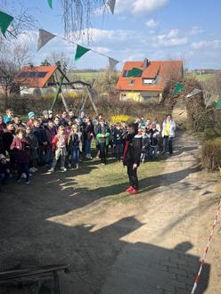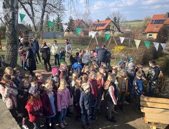 Gemeinsam mit allen geladenen Gästen, dem Bürgermeister Herrn Arlt, Frau Koppatsch als Vertreterin vom Förderverein “Wir für Kinder“ e.V., dem Schulleiter Herrn Schönknecht, Herrn Nitsche und dem Hausmeister Herrn Lips, sammelten sich alle Kinder und Erzieher gegen 13.30 Uhr auf der Hortwiese.