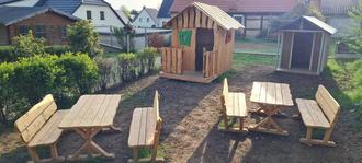Herr Oliver Nitsche, ein Fachmann im Bau von Kinderspielplätzen und Vati, erhielt den Zuschlag und zimmerte für die Kinder ein wunderbares, stabiles und geräumiges Echtholz- Spielhaus, dazu zwei Sitzgarnituren mit Bänken und Tischen. - Einfach toll!