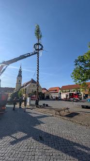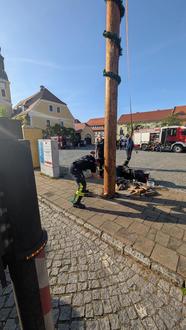 Am letzten Tag des Monats April war es wieder mal so weit. Bei schönstem Wetter und herrlichem Sonnenschein traf sich die Feuerwehr Weißenberg zum traditionellen "Maibaumstellen" auf dem Markt. Für einige Kinder der Jugendfeuerwehr war es das erste Mal, wobei einige der älteren Kameraden schon ihren 40. bzw. 42. Maibaum stellten. Hand in Hand gingen die Vorbereitungen und das Kranzanhängen vonstatten. Nach gut einer Stunde stand er auch schon an seinem Platz und wurde durch kräftige Schläge im Boden gesichert.
