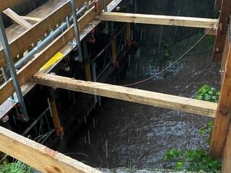 1. Juni 2024 - Hochwassergefahr - eingerüstetes Brückenbauwerk am Abzweig Grünau und Zwickauer Mulde