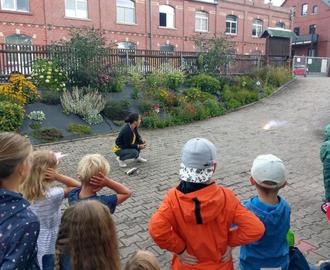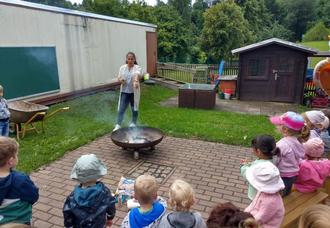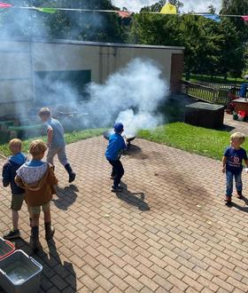 Wir untersuchten unter anderem was brennt und was nicht. Dafür gab es im Garten ein Lagerfeuer. Wer wollte, konnte mit Spritzpistolen Dosen „löschen“ und danach das Lagerfeuer.