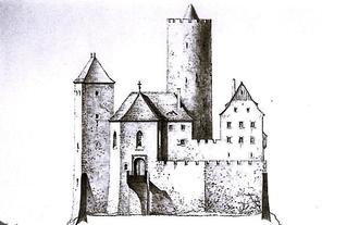 Entwurf der Kern-Burg Wiesenburg (hier ohne Vorburg, Blick nach Nordwesten, Bautenstand Anfang 17. Jahrhundert) nach historischen Quellen durch Walter Bachmann im Jahre 1944, erster sächsischer Landeskonservator 1920-1945. Landesamt für Denkmalschutz Dresden. Bildersammlung.