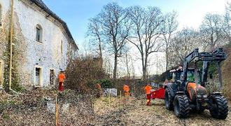 | 4. | Am 28. Februar 2025 schnitten die Mitarbeiter des Bauhofes Wildenfels die Ostseite der Außenfassade frei, damit dort eine Baueinfahrt für LKW und Feuerwehr neu errichtet werden kann. Vielen Dank den engagierten Bauhofmitarbeitern samt Bürgermeister! |