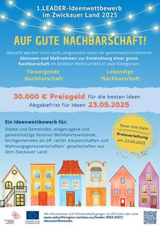 Die LEADER-Region Zwickauer Land startet am 31. März 2025 ihren neuen Ideenwettbewerb unter dem Motto „Auf gute Nachbarschaft!“. Gesucht werden noch nicht umgesetzte Ideen für gemeinwohlorientierte Aktionen und Maßnahmen zur Stärkung der Nachbarschaft – im Mehrfamilienhaus, in der Straße oder in der Siedlung. Dazu gibt es zwei Wettbewerbskategorien: „Fürsorgende Nachbarschaft“ für Projekte, die nachbarschaftliche Hilfen und Unterstützung in den Mittelpunkt stellen, sowie „Lebendige Nachbarschaft“ für Begegnungen und gemeinschaftliche Aktivitäten.