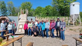 Vorausgegangen war nach dem Treff am „Fuchsbau“ ein Spaziergang über die Lindenstraße am ehemaligen Roten Hirsch wie auch an der „Hummelslust“ vorbei bis zum Ort des Geschehens. Dort vereinigten wir uns mit den motorisiert angereisten Vereinsmitgliedern. Der Grill war schon angeheizt, doch vorher nahmen wir uns genügend Zeit für das Objekt unseres Besuches, den Kalkofen.