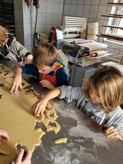 Schnell teilten wir uns auf und dann konnte es auch schon losgehen. Eine Gruppe durfte Pfefferkuchenherzen und Plätzchen mit Zuckerguss und bunten Streuseln verzieren. Die andere Gruppe lernte in dieser Zeit die Teigmaschine kennen, und erfuhr, dass ein Bäcker den Teig nicht mit einem Nudelholz ausrollt, sondern auch eine Maschine dafür hat. Danach ging es ans Plätzchen ausstechen. Flink füllten sich die Bleche und ab und zu landete auch eine kleine Kostprobe in unseren Bäuchen.