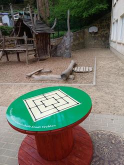 Ende April 2024 wurden die durch Frau Rahm organisierten Kabeltrommeln abgeschliffen, gestrichen und mit Wechselbaren Brettspielen versehen. Die Kinder haben seitdem die Möglichkeit Mensch-Ärgere-dich-nicht, Dame, Mühle oder auch Schach auf dem Schulhof zu spielen.