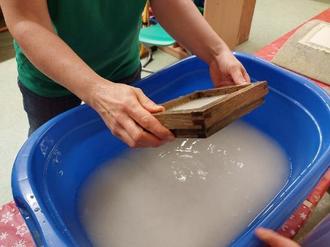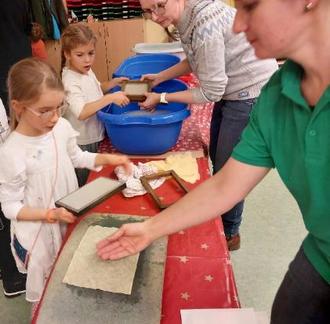 Mit dem Weihnachtsmarkt in der Grundschule endete das Jahr. Wir haben in diesem Jahr gemeinsam mit den Kindern Papier geschöpft. Somit konnten alle, die Lust hatten, ihr eigenes Weihnachtspapier entwerfen.