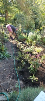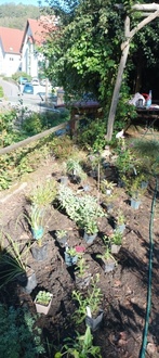 Zuerst wurden Blühsträucher gepflanzt: Felsenbirne und Rosen als die hervorragendsten Hingucker. Danach wurden die gekauften wie auch vorhandene Stauden nach Pflanzschema „ausgestellt“. Die Profis haben so etwas im Hinterkopf und schon einen Blick dafür: wohin mit Gerüstbildnern, Begleitstauden, Bodendeckern und Füllpflanzen ... Es flogen die leeren Pflanztöpfchen en masse und es war eine Freude, sowohl für die pflanzenden Gärtnerinnen als die staunende Assistentin J. Noch vor dem ausgiebigen Angießen fanden sich die ersten Schmetterlinge an den auch jetzt im Herbst noch blühenden Stauden, um das neue Buffet zu testen. Damit waren dann Mensch und Tier gleichermaßen zufrieden. Am Ende werden noch Blumenzwiebeln und -knollen nachgesteckt, an denen sich die Insekten nach dem Winterschlaf gleich als erstes laben können.