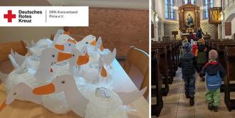 In diesem Jahr machten die Kinder der DRK-Kita Elbkinderland zum Sankt Martinstag einen ganz besonderen Ausflug. Wir haben die Kirche in Stadt Wehlen besucht. Jedes Kind hatte für diesen Tag seine in der Kita gestaltete Laterne in Form einer Gans dabei. Die Gans spielt in der Geschichte vom heiligen Sankt Martin immerhin eine ganz spezielle Rolle. In der Kirche sprachen wir zunächst darüber wer Sankt Martin eigentlich war und sangen begleitet von der Orgel das Lied „Sankt Martin ritt durch Schnee und Wind“. Im Anschluss daran teilten wir nach altem Brauch die Martinshörnchen miteinander.