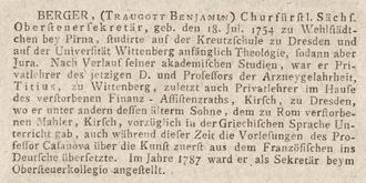 Genau vor 270 Jahren erblickte ein später prominenter Einwohner aus dem Wehlstädt’l das Licht der Welt. Ihm wurde zu Lebzeiten Großzügigkeit und Güte unter der Wehlener Bevölkerung nachgesagt. Als er nach seinem Studium in Dresden (Kreuzschule) und Wittenberg fast jährlich in seinen Geburtsort zurückkehrte, wurde dies wie ein „Volksfest“ im Städt‘l gefeiert. Traugott Benjamin Berger wurde am 18.Juli 1754 im Wehlstädtchen geboren. Nach dem Besuch der Wehlener Schule, bei Georg Opitz und später Christian Gottlob Krille, ging er auf das Kreuzgymnasium (ein Vorläufer der Kreuzschule) in Dresden. Hier genoss er unter dem Rektor Johann Purgoldt eine fundierte Ausbildung in Theologie, Mathe, Latein u. a., in Wittenberg Jura.