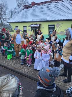 Die Erzieherinnen Ute Lier (Leitung), Steffi Spitzhüttl, Katrin Giese, Sandra Schuster und Helferin Sandra Kraupner sowie alle Kinder der Kita, führten am 01.12.2023 zum Kita-Weihnachtsmarkt ein sehr schönes Programm auf.